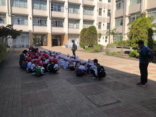 とてもいい天気に恵まれました。出発前に担任からの注意事項をしっかりと聞いています。