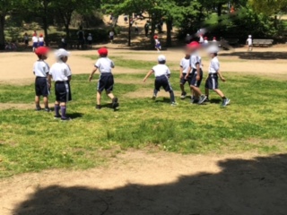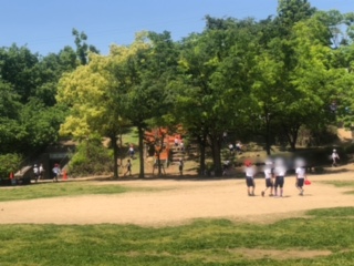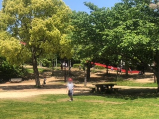 広い緑地でのびのびと遊べます。小学生(たぶん1年生)、幼稚園・保育園の子どもたちがいっぱいきています。大和田小学校の子どもたちだけを写すのは一苦労です。