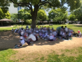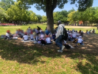 いっぱい遊んで、いよいよお弁当タイムです。大きな楠(くす)の木の下で、全員が木陰に入ってお弁当を食べます。