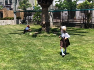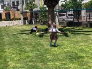 週末にきれいにしていただいた芝生で子どもたちが楽しく遊んでいます