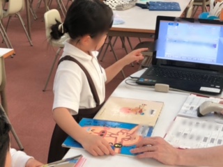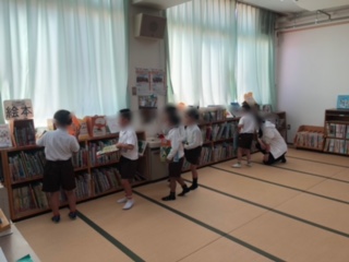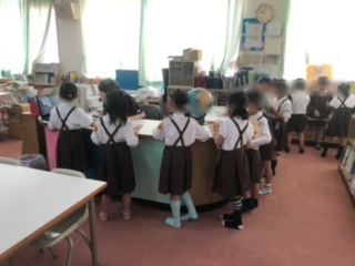 学校図書館で本を選んでいます。学校司書の方が貸出を行っています。