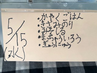 今日の給食は、かやくごはん、みそ汁でした。きざみのりもつきました。
