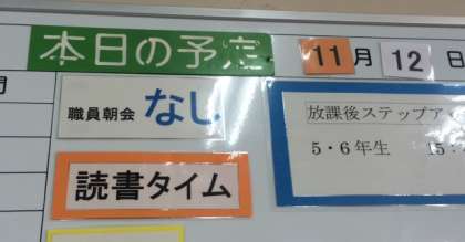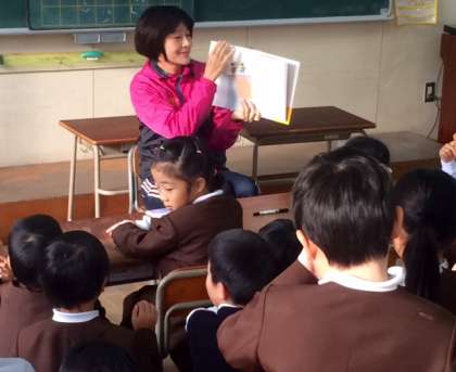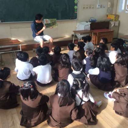 特に低学年のクラスでは、絵本の読み聞かせをしています。クラスによっては、担任の先生に代わって、絵本を読んでいます。こどもたちは、目を光らせて話に聞き入っています。