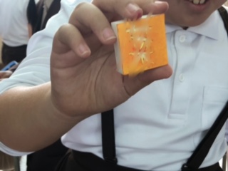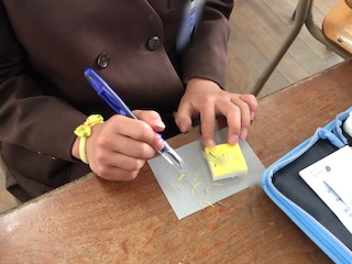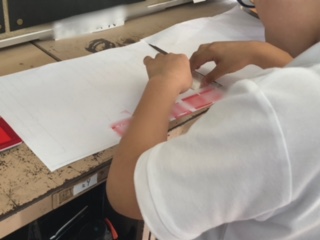 彫刻刀で消しゴムはんこを作っています。できたはんこを押しています。