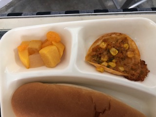 今日の給食には、ピザ、缶詰のフルーツがでました
