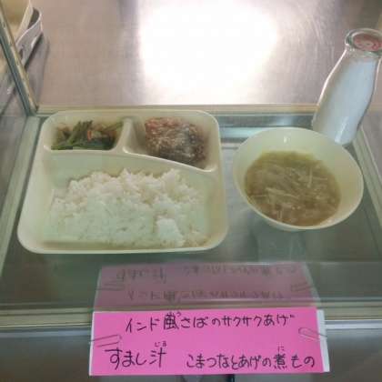 今日の献立は、インド風サバのサクサク揚、小松菜と厚揚げの煮物、すまし汁、ごはん、牛乳です。