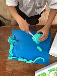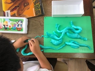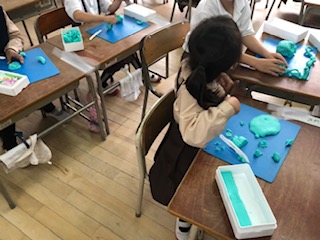 今日は雨のため、運動場では遊べません。1年生が粘土で遊んでいました。