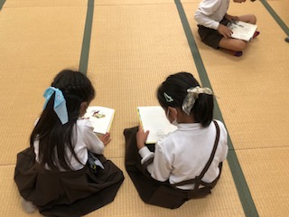 学校図書館には、畳(たたみ)の部屋があります。座って本を読んでいますね。写真上は、貸出をする学校司書です。