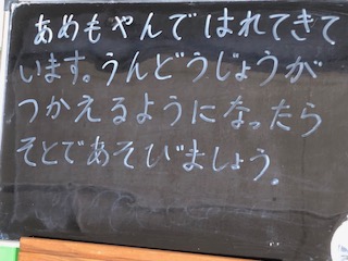 5月ではないような大雨もようやくやみました。今日は晴れの天気となっています。運動場のぬかるみがなくなったら外で遊べます。子どもたちは待ち遠しいでしょうね。