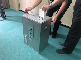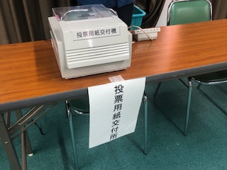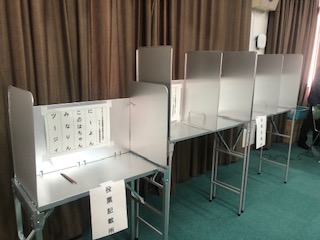 実際に選挙で使用される物が置かれています。この後、子どもたちは模擬投票をしました。