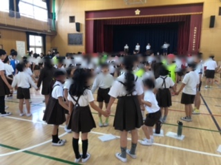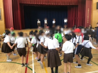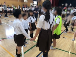 たてわり班で輪になってゲームをしています