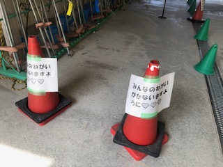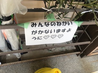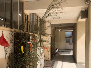 記念行事の一つとして七夕飾りをしています。職員室前に全校、通路に各クラスの笹が置かれて、子どもたちが短冊に願いを書いています。