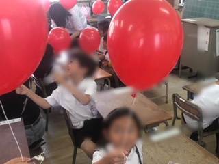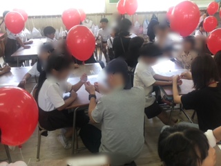 1年生はたくさんの大人が手助けしています。メッセージカードを付け終わった子どもたちは大喜びの表情です。