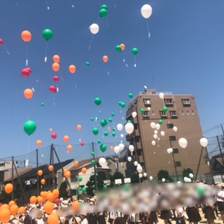 バルーン(風船)が空へと上がっていきます。バルーンの色は名札と同じです(6年生は白色)
