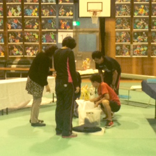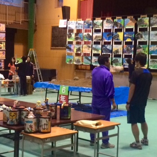 児童が下校したあと、教職員は作品展の準備をしています。子どもたち一人一人の個性の輝きが講堂に広がってきました。