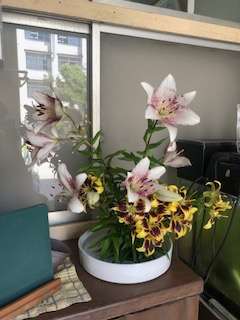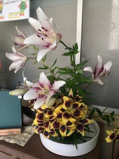 中庭のゆりの花が咲き誇っています。横に伸びた枝を整理して、花を校長室に飾りました。