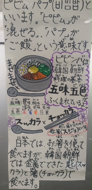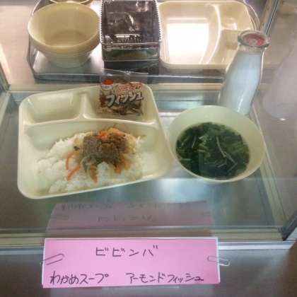 今日の献立は、ビビンバ、わかめスープ、アーモンドフィッシュ、牛乳です。
