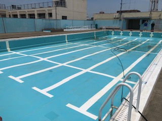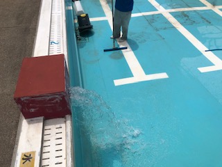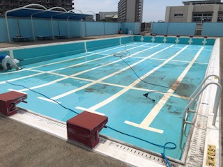 業者により、プールの清掃が行われました。プール水泳は来週から始まります。今週は、プールをきれいにして、安全面を確認していきます。