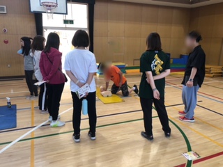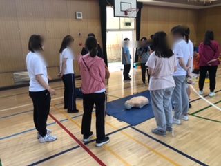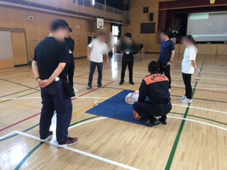 教職員が、研修用の人形を使って順番に人工呼吸法やAEDの使い方を学んでいきました