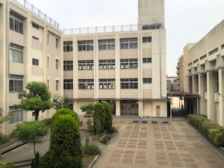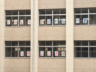 窓にスローガンが貼られています。「たのしー!うれしー!なかよし!」