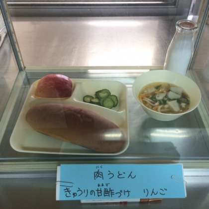 今日の献立は、肉うどん、キュウリの甘酢漬け、黒糖パン、リンゴ、牛乳です。