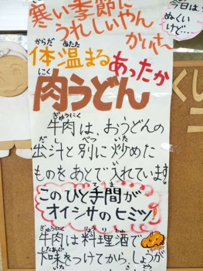 お日様にあたっていると暖かく、教室の中はまだ肌寒いです。今日はそんな季節に嬉しい給食です。