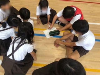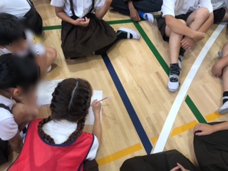 たてわり班でジェスチャーの答えを考えています