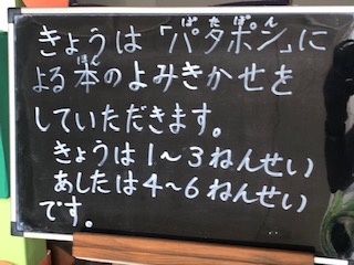 今日は、パタパンによる読み聞かせです。今日は1、2、3年生。明日は4、5、6年生です。