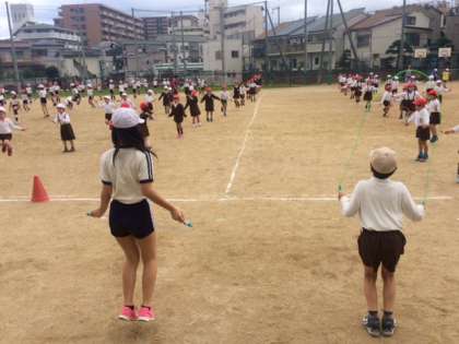 今週の15分休憩は、縄跳び週間(1年生〜3年生)です。運動委員会の手本を見て、1,前跳び、2,後ろ跳び、3,駆け足跳び、4,チャレンジ跳びを行いました。