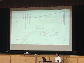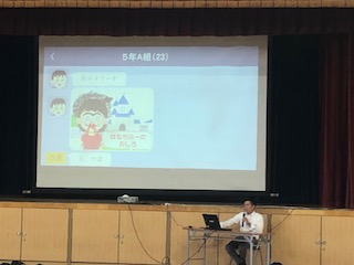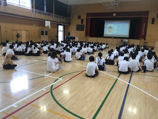 講堂で行いました。実際にあった内容をもとにアニメなどを用いてお話されました。