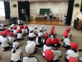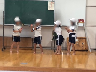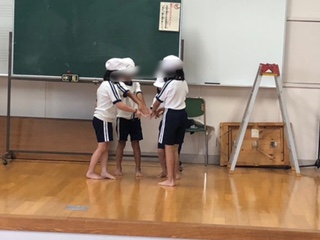 雨のため、プール水泳は中止となりました。代わりにダンスをしています。グループで振り付けを考えて、みんなの前で踊っています。