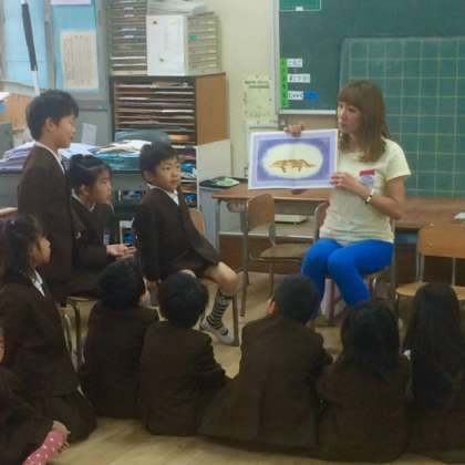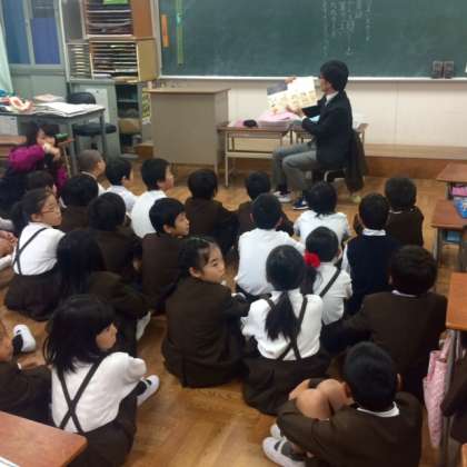 低学年は、絵本の読み聞かせです。担任に代わって、他の先生も教室にやってきます。子どもたちの目はキラキラと輝き、お話に集中しています。