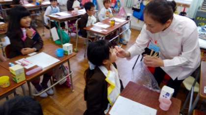 鏡を見て口の中を点検したり、虫歯にならないために、どうしたらいいか歯科衛生士さんから学んでいます。