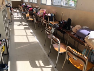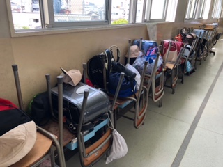 机と椅子が廊下に置かれています。教室のワックスがけをするのでしょうね。