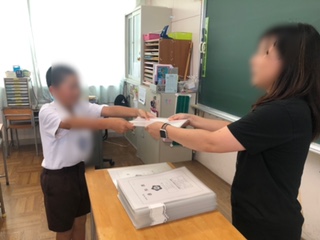 明るい雰囲気で通知表が渡されています