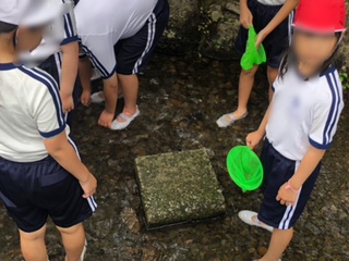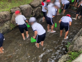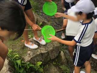 魚はなかなかつかまりません。網まで使ってつかまえます。