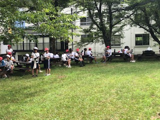 木陰のテーブルに座って磨いていきます