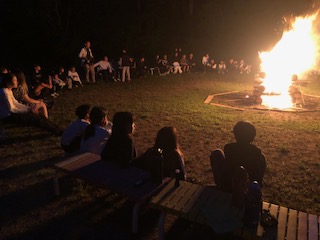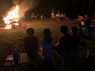 キャンプファイヤー 炎の前で