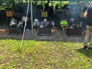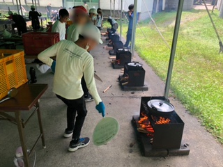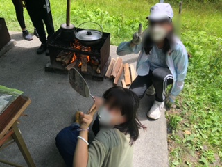 野菜を切る、飯ごうでご飯を炊く、に加えて、かまどでの火起こしも大切です。担当の子どもたちががんばっています。