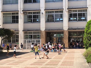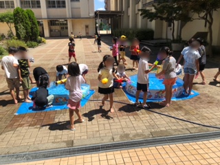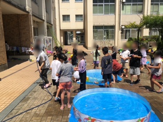 いきいき活動の子どもたちが中庭で水遊びをしていました。