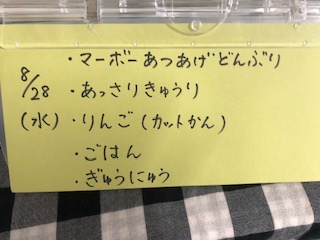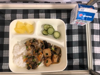 今日の給食には、厚揚げが使われています。りんごの缶詰もつきました。