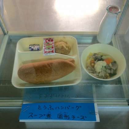 今日の献立は、とうふハンバーグ、スープ煮、固形チーズ、ライ麦パン、牛乳です。