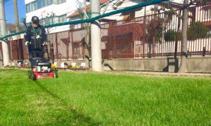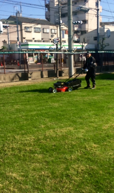 芝生広場の冬芝も順調に成育しました。今日はグリーンコーディネーターの松崎様が、芝刈りに来てくださいました。