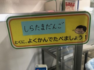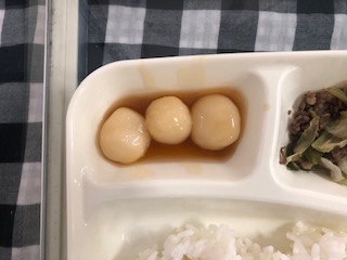 月見のだんごです。白玉だんごを食べる時、のどに詰めないように、よくかんで食べてように注意を促しています。放送でも気をつけるように話しました。