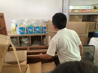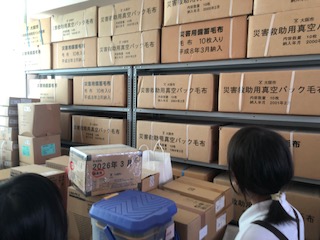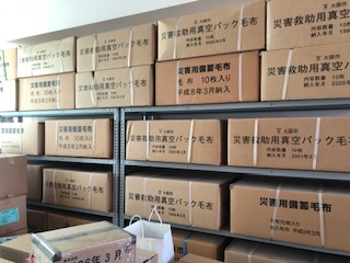 備蓄倉庫には、水、毛布、簡易トイレ、仕切り板などが置かれてあります。