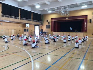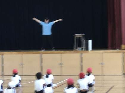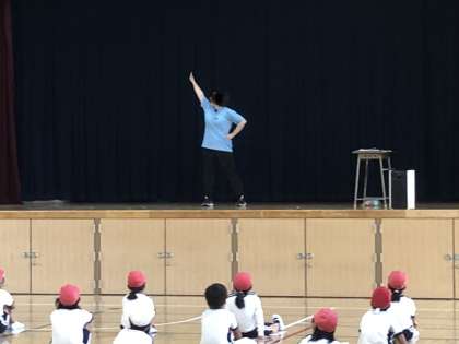 運動会の練習が始まっています。教員がダンスの見本を見せています。