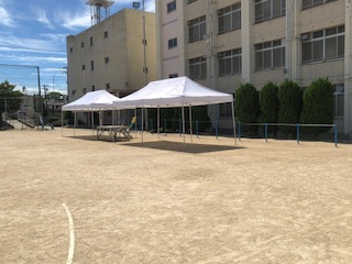 暑さ対策のため、運動場にテントを張っています。影ができています。