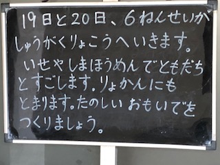 本日と明日、6年生が修学旅行へ行きます。伊勢、志摩方面で友だちと2日間すごします。