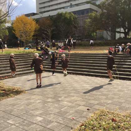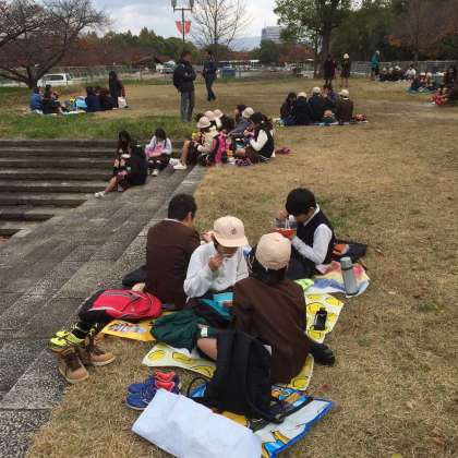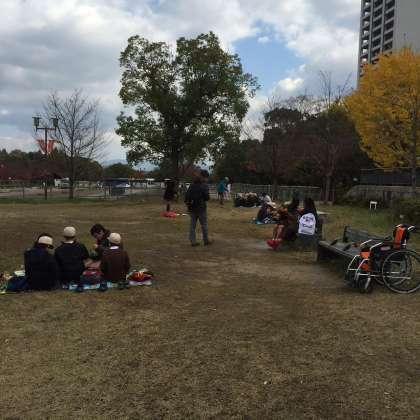 寒空の下、大阪城公園で、ただいま昼食中です。