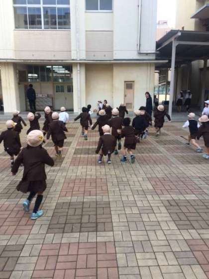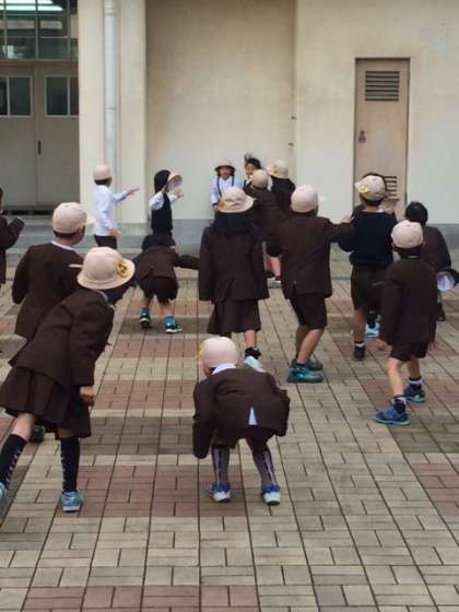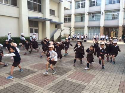 休み時間に中庭で、1年1組が学級遊びをしています。
